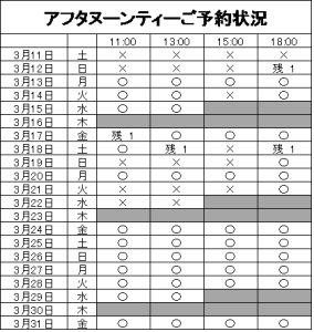 2023.03.10 アフタヌーンティーのご予約状況について 3/10現在のアフタヌーンティーのご予約状況を掲載させていただきます。ご参照の上お問合せいただければと思います。なお。当店のアフタヌーンティーは5/10まで開催致しますので、どうぞよろしくお願い致します。 ← 次 一覧ページ 前 →